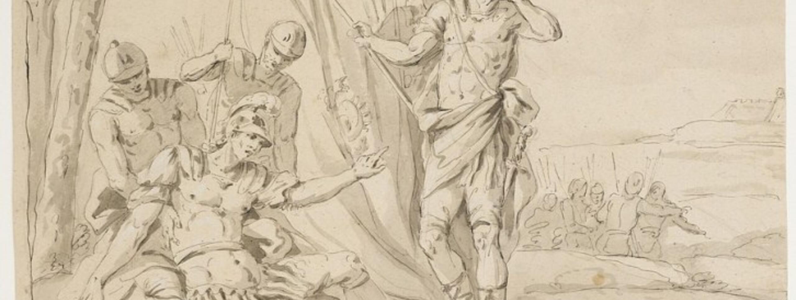 The Townshend monument is composed of two atlantes (male caryatids), flanking an inscription panel, and supporting a sarcophagus containing a death scene relief panel, and this is surmounted by military trophies, and set against a pyramid in relief. In Adam’s drawing the atlantes are shown as antique Roman slaves, but in execution they were Native American men (cultural group unknown), presumably referring to the location of Townshend’s death. They establish a pleasing stylistic contrast with the rest of the monument which is entirely classical. Indeed, it has been noted by John Fleming that the composition of a sarcophagus supported by caryatids or atlantes may have been inspired by Italian Renaissance monuments such as that for Pietro Lombardo at SS. Giovanni e Paolo, Venice; but it is also important to note that within Adam’s possession was a drawing of various Roman tombs by his tutor from the Grand Tour, Charles-Louis Clérisseau (1721-1820). Two of the tombs depicted in Clérisseau’s drawing comprise a strigilated casket supported by terms, being reminiscent of Adam’s design for the Townshend monument with its atlantes.