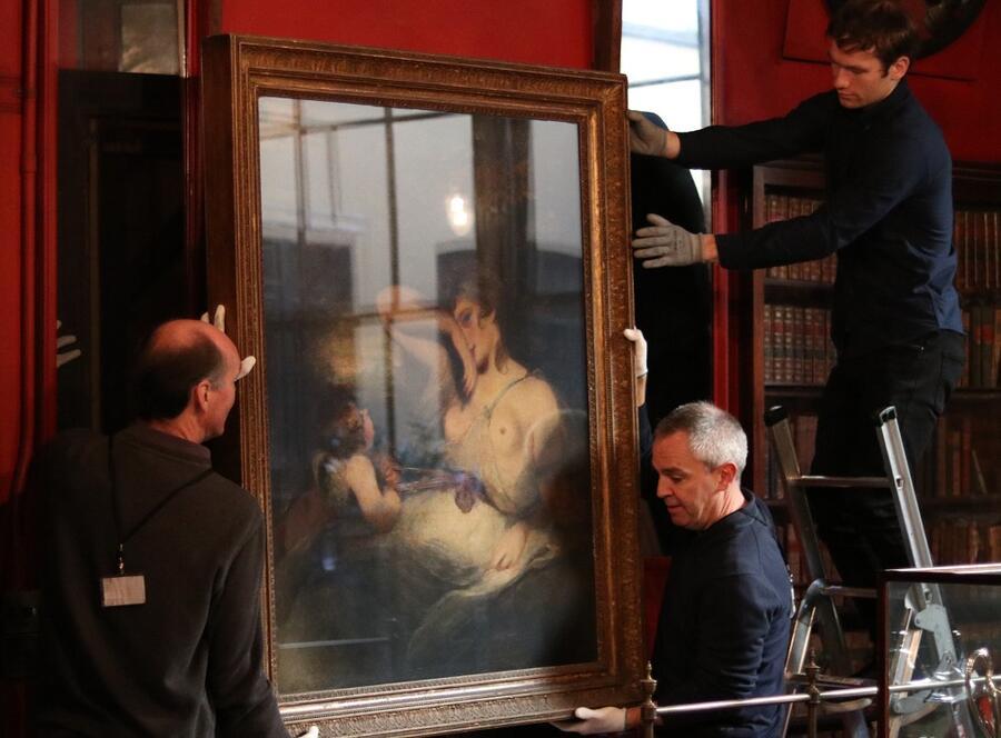 Image: Art handlers carefully remove The Snake in the Grass from its position on the west wall of the Library Dining Room