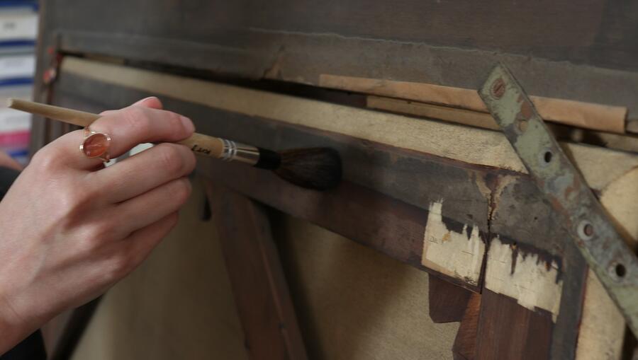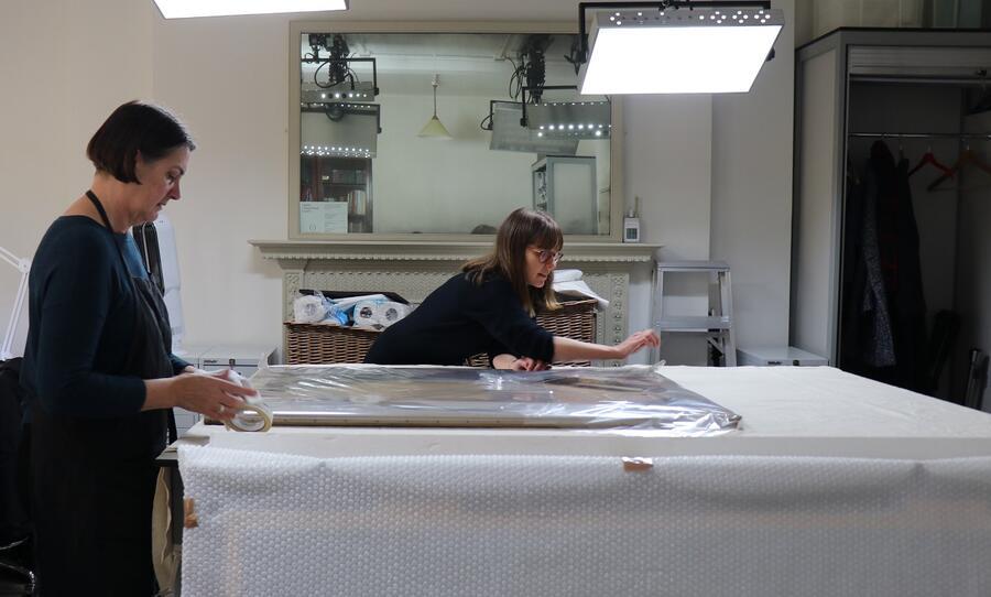 This week, art handlers arrived to deinstall The Snake in the Grass from the walls of the Library Dining Room. The painting was carried through the Museum up to the conservation studio, ready for work on the frame to begin.