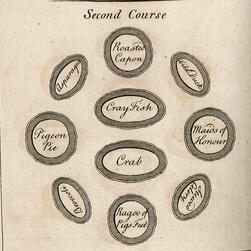 One of the features of this book is a series of engravings of suggested menus for each month, based on the food then in season, and showing how the dishes for the first two courses, a mixture of sweet and savoury, would have been laid out on the table.