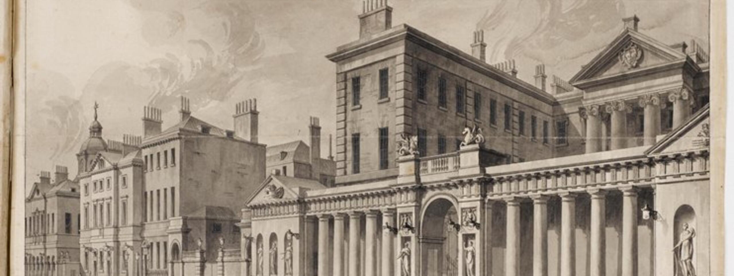 Further to this, Adam produced individual drawings for engraving and sale. This was done in the case of the Admiralty Screen, his first executed public commission in London, of which he was apparently exceedingly proud. Thomas Ripley’s Admiralty was built in 1723-26, but its boundary wall was demolished for street widening in 1759, prompting Adam’s commission to build a screen. This view by the Adam office draughtsman, Agostino Brunias, was made for publication, and shows the Screen as executed, albeit with additional sculptural ornament. There is evidence that the sheet was folded four times, most likely when it was sent to Francis Patton to be engraved for publication. The Admiralty Screen engravings were sold from February 1761 at Andrew Millar’s bookshop on the Strand for 2s.6d.