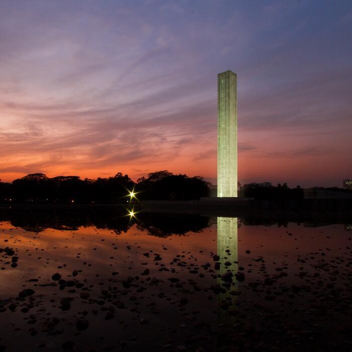 In 1997, one and a half years after our practice’s conception, we won a competition to design and build the Museum of Independence of Bangladesh in Dhaka. Hard won and much awaited, we nonetheless understood the immense responsibility associated with the opportunity. The project demanded an investigation into contemplation and timelessness. The liberation of Bangladesh is a tale of duality: independence gained through the selfless sacrifice of a brutal war. Freedom has a preferred direction: upwards. Anything aspirational assumes an upward gait. And yet, memory, loss and sadness urges for the subterranean: a desire to be buried and also, after a time, unearthed. We introduced a horizontal expanse parallel to the flatness of the park, a platform of celebration: and a vertical offering of hope, defined by the Tower of Light. The history of revolution, struggle and genocide was gently tucked below ground in the museum beneath the plaza. The project that began with positive vigour in 1998 finally found its completion, sixteen years later, in 2013.