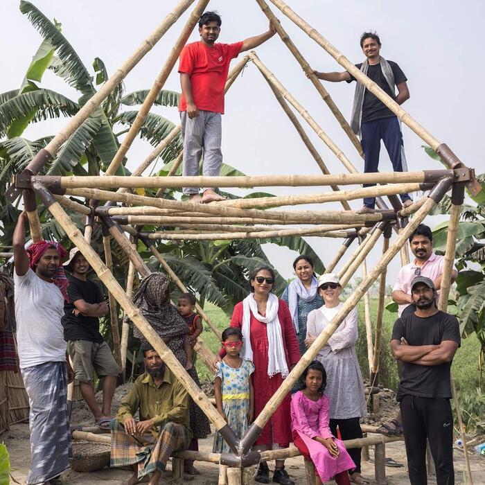 In 2020, our MTA office work slowed down during the first wave of the Covid-19 pandemic. We dedicated the lull to exploring the idea of a flat-pack modular house for the landless char dwellers. This exploration resulted in Khudi Bari, a lightweight modular spaceframe structure with bamboo and steel joints, easy to assemble and disassemble. A three-metre module of Khudi Bari costs £300 and can house a family of four. To date, we have housed four families in Char Hijla, in order to understand the natural responses of local people. We are in the process of housing one hundred families by June 2023. Architects of the twenty-first century must address the imbalance in our environment created by extraction, over production and exploitation of resources that has put our existence in crisis. Architecture can transform our stock pile of waste into potential building materials with collaborative research.