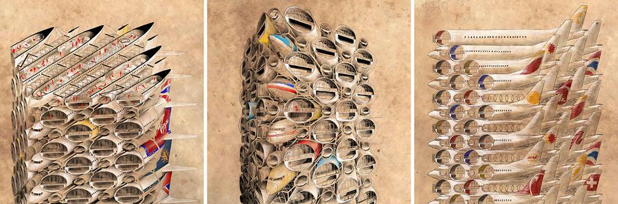 ‘Covid-19 halted air travel and exacerbated affordable housing shortages. If aeroplanes are buildings that fly, why not upcycle them as building materials? Our proposal of vertically stacking decommissioned aeroplanes into a residential tower also creates the poetic irony of sending flightless aeroplanes back to the sky.’
