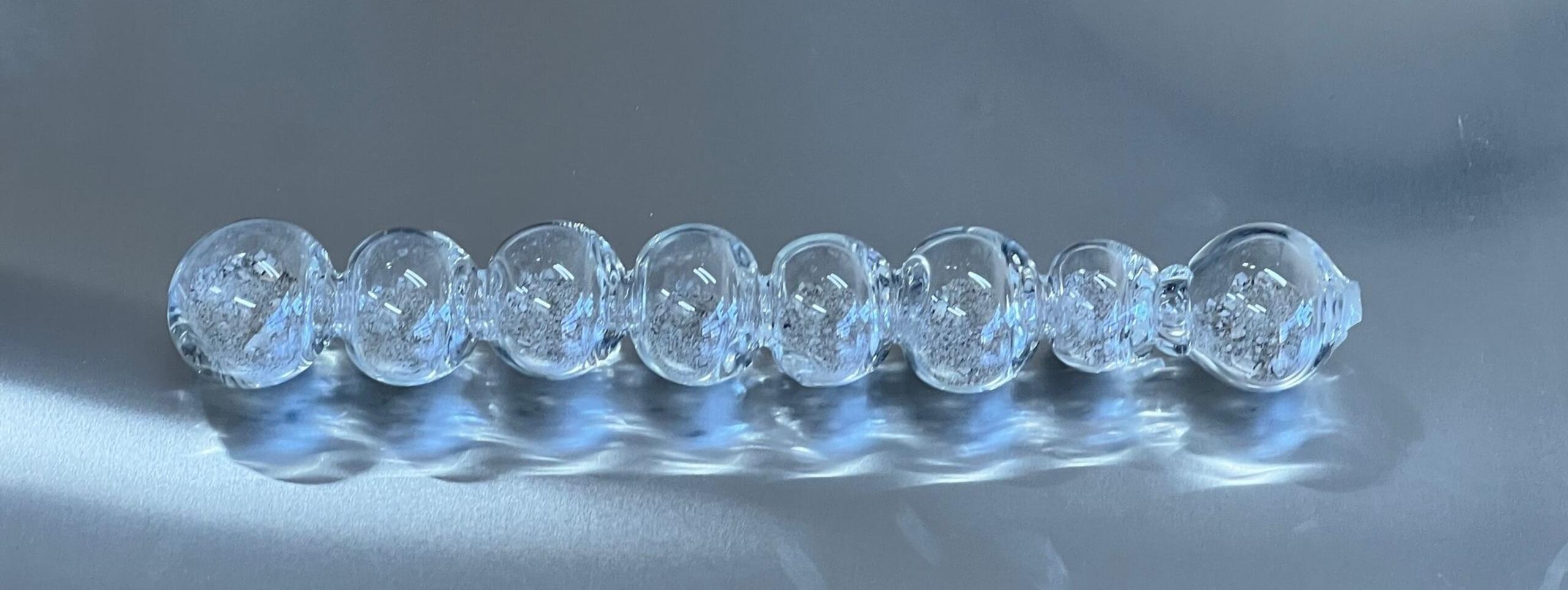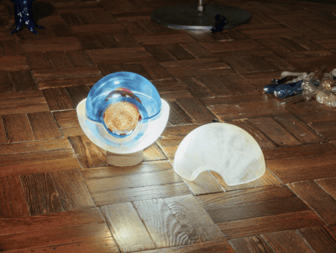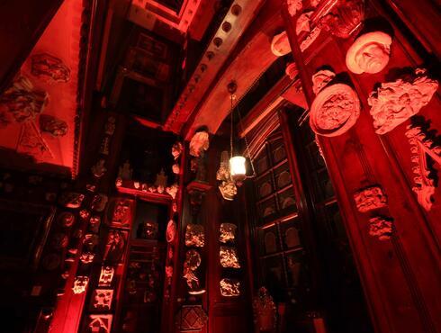The artist was particularly inspired by Soane’s famous visions of his Museum in ruins, his interest in magic, and the mysterious, romantic light effects he achieved with coloured glass. In response to the Museum, Neelova has created an installation which evokes an alchemist’s laboratory. Her use of coloured glass is inspired by Soane and also by the links between the development of optical theory and glassmaking. This is exemplified in Second Sight, a glass ‘eye’ featured in the centre of the installation which is inspired by eighteenth-century glass anatomical models of eyes in the Josephinum Museum in Vienna. Neelova collaborated with Studio Mark Barreda to create a number of hand-blown glass lacrymatories using historic glass recipes. Some of these replicate flaws in early glass recipes, meaning that the glass will eventually transform into water vapour. The wooden sculptures in the installation are made from reclaimed handrails, some of which were salvaged from St James’s Underground station. They are a reference to Soane’s sculptural stair cases. The ‘thorns’ which appear to grow from the grilles around the room are made from petrified sharks’ teeth set in clay. They evoke the idea of the Museum as a ruin, being reclaimed by nature.