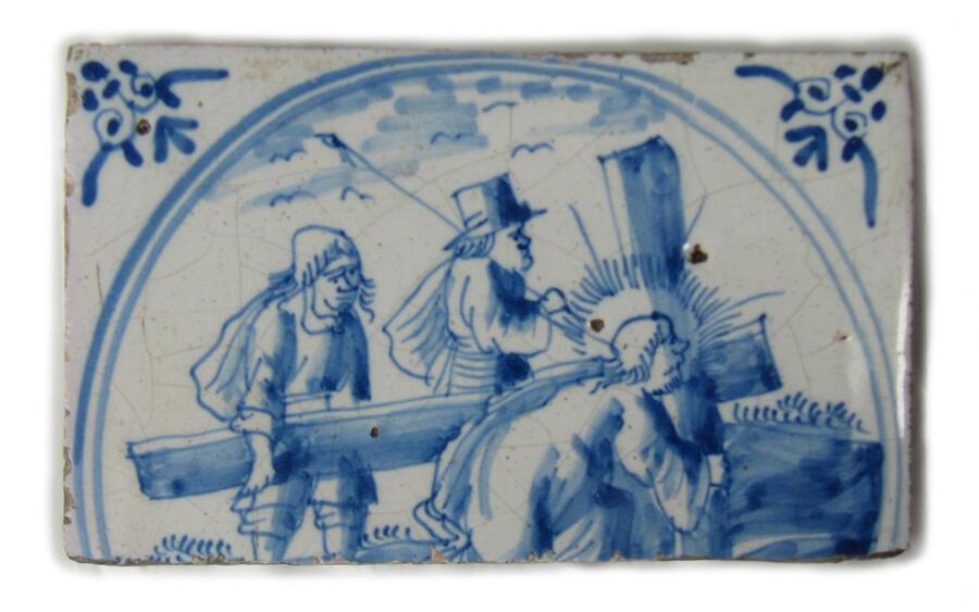 This object is one of 50 Delft tiles discovered in a cardboard box in the China Pantry in the 1990s. The tiles are not listed in the 1837 inventories of Soane’s collection, which may indicate that they were affixed to a wall at that time. The condition of the tiles supports this idea because they have remnants of plaster on their backs. Additionally, many are damaged which indicates that they were somewhat crudely removed from a wall. We know that a second-floor watercloset – dismantled in the late 19th century – was decorated with blue and white tiles and ‘Dutch tile paper’ during Soane’s lifetime. It’s likely that these tiles came from that space.