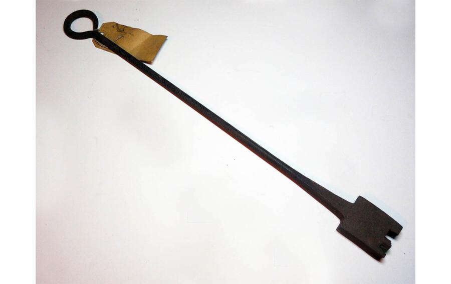 This tool was discovered in the Museum’s basement in the 1990s. The Minutes of the Trustees’ meeting held in February 1893 record their resolution ‘that an iron stamp be obtained with which to brand the ladders etc. belonging to the Trustees’. The brand would have been heated in the open fire of one of the kitchen ranges before being used to burn the initials onto the wooden ladders, making it difficult for them to be mistakenly removed from the Museum.