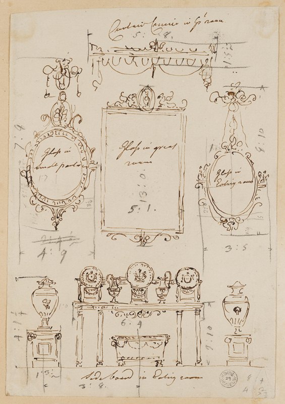 In addition to an architect’s reputation, the best means of marketing an architectural practice was through publication of past endeavours. Robert Adam was a master of advertising his own brand. He produced two major architectural treatises. First was ‘The Ruins of the Palace of the Emperor Diocletian…’ (1764) with which he marketed himself as a connoisseur of antiquity and gave academic credence to his style. Second was ‘The works in architecture of Robert and James Adam’ (1773-78, 1779, 1822) a three-volume retrospective of his greatest masterpieces. Extant within the drawings collection at the Soane Museum is a rough preliminary design in Robert Adam’s own hand showing how one of the plates for ‘The works in architecture…’ was originally laid out.