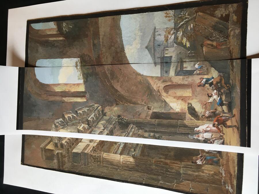 The plan was to replace the fifteen paintings with high quality facsimiles which would be displayed in the original frames. First, we removed the pictures from their frames and, after conserving them, put them into permanent storage in a new purpose-built plan chest. Next, we began the process of producing the facsimiles, which proved both complex and time consuming. Each painting had to be scanned, and the scans painstakingly colour corrected by the printer, with direct reference to the original so that all the colours were accurately matched. It took three days to prepare the prints which were produced on Hahnemühle Rag paper using water based-inks. The results were excellent. Two of the fifteen were the pair of gouaches by Clérisseau and the facsimiles for these are particularly successful.