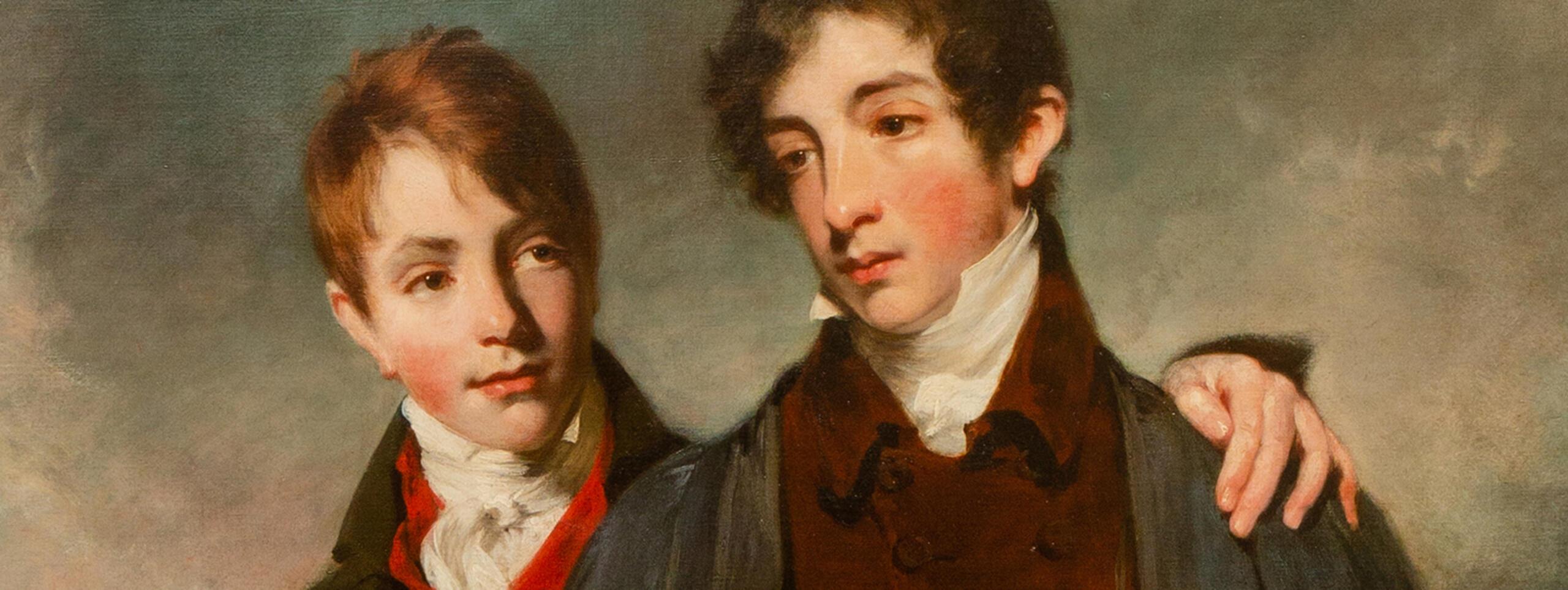 A 51-year old Soane, Professor of Architecture at the Royal Academy, points to a diagram of the Roman Temple of Vesta at Tivoli, which inspired some of his most famous designs. Alongside this portrait, a second painting depicts his two sons, John Jr and George, appearing to share this academic spark, with John Jr. sporting his Oxford gown. Sir John Soane had longed to found a dynasty of architects to rival the Adams or the Dances, and these portraits, painted by the renowned portraitist William Owen, may project these ambitions.
