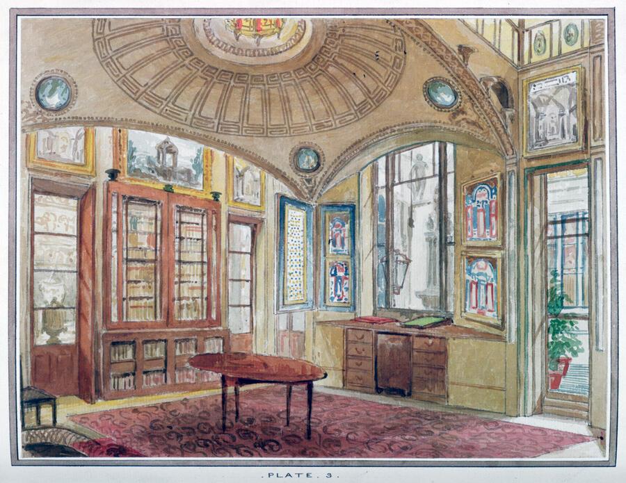 Amongst the constituents of a ‘correctly picturesque’ landscape, a ruin – preferably of an abbey or castle - was considered a vital feature. Here too, Soane’s house fulfils the brief, with the mock-medieval ruins of an abbey in the Monk’s Yard, composed of fragments salvaged from the medieval palace of Westminster. In the 18th century there was a fleeting fashion for employing a hermit to animate a picturesque hermitage in a landscape – John Soane created his own imaginary solitary hermit, supposedly a former occupant of his mock abbey, whose tomb is set amidst the ruins. This holy father was his own alter ego, bearing the name Padre Giovanni (‘Father John’): with his creation Soane made himself a feature of the picturesque landscape he created in Lincoln’s Inn Fields.