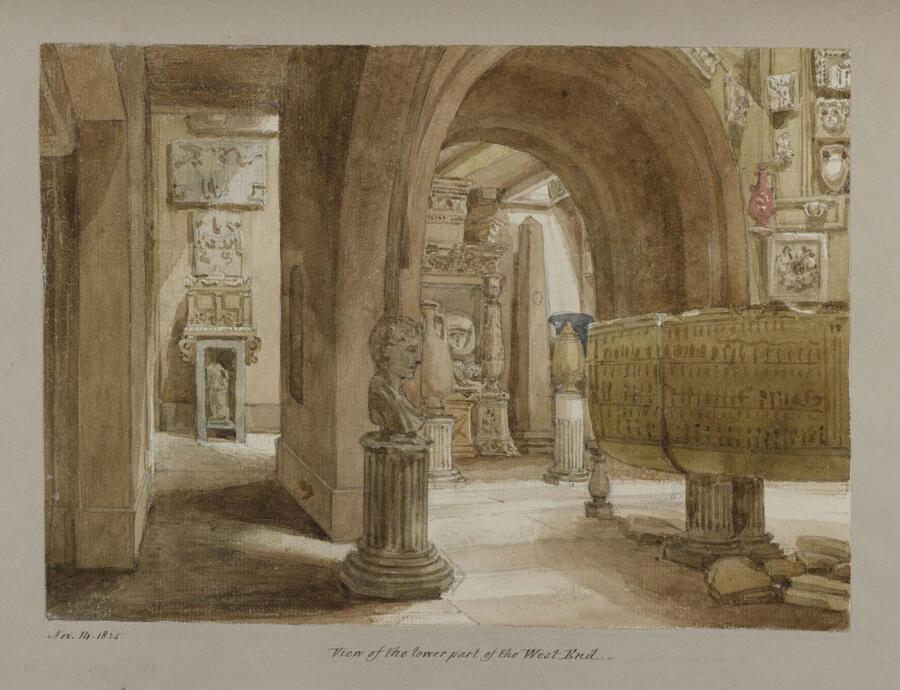 View in the basement of Sir John Soane’s Museum looking from the Basement Ante-Room towards the Sepulchral Chamber, watercolour, dated 14 November 1825, SM Vol. 82/50