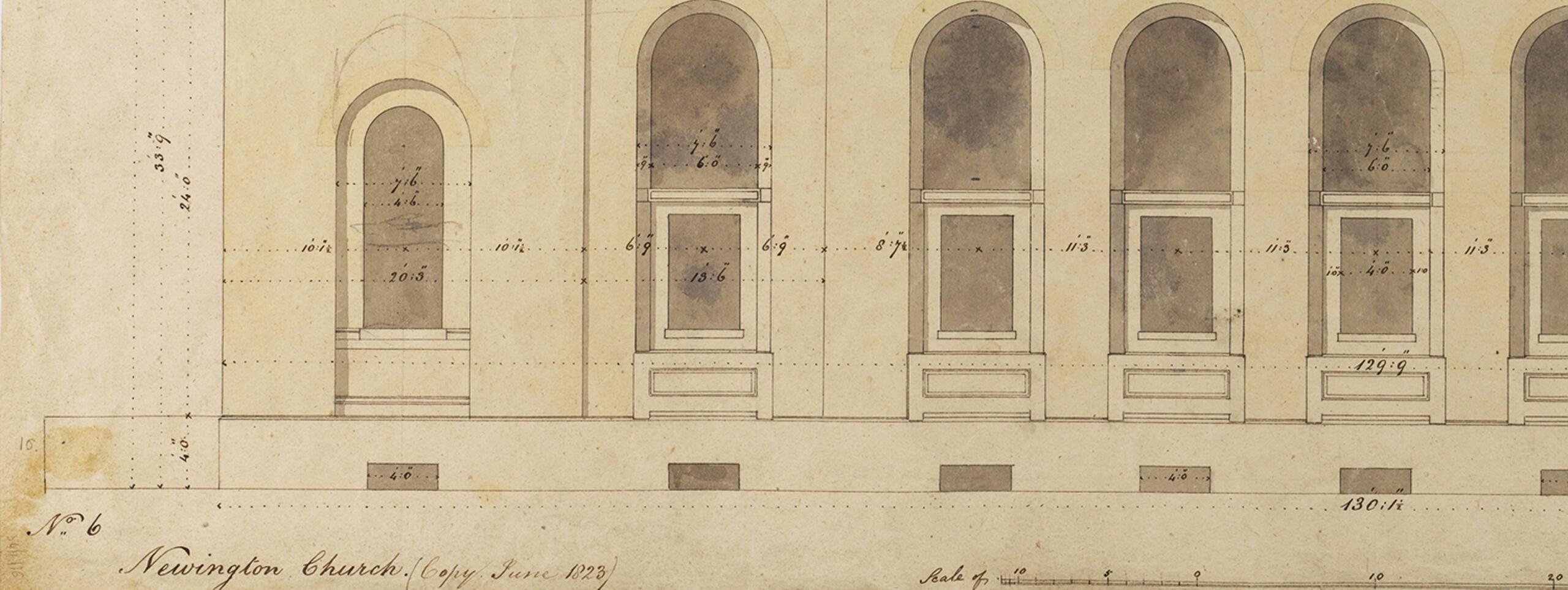 Fig. 2. Soane office hand, elevation of St Peter’s, Walworth, 1823, SM 54/6/16. Photo: Ardon Bar-Hama ©Sir John Soane’s Museum