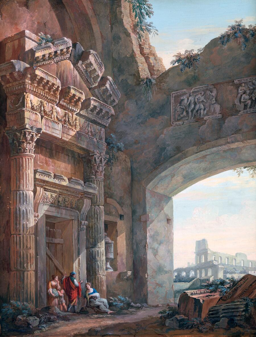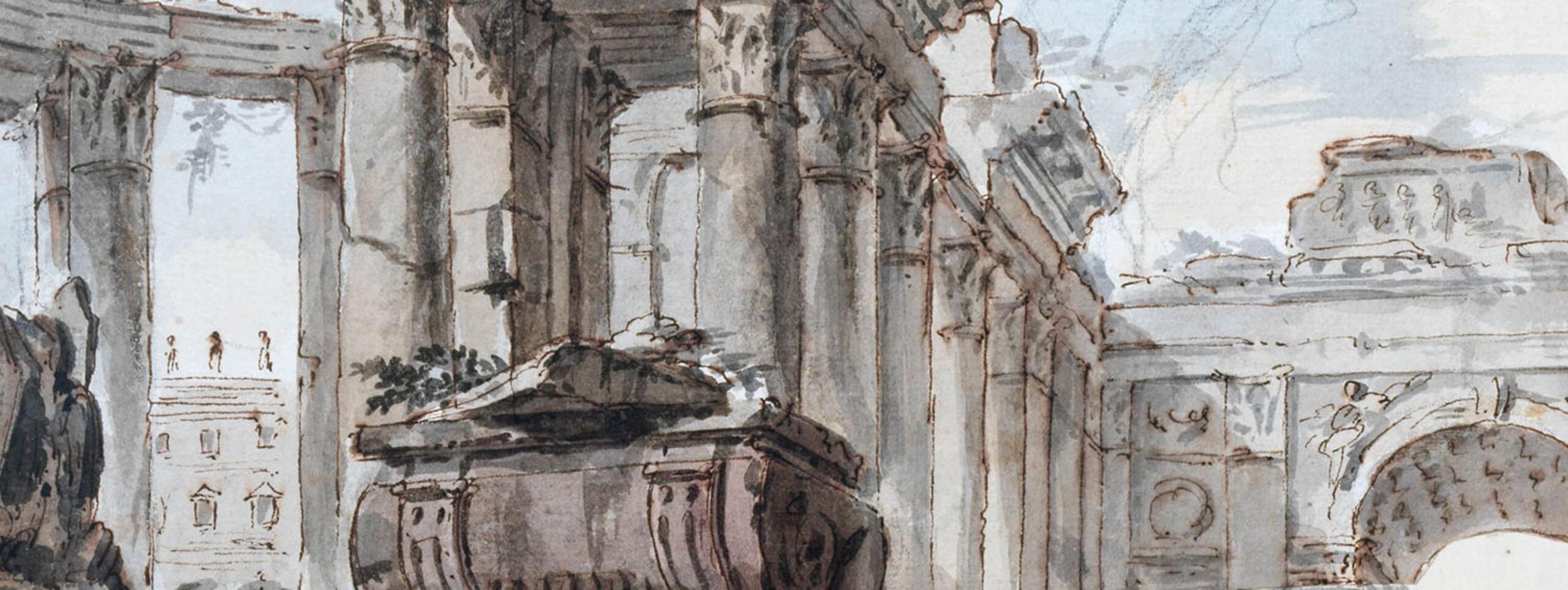 Clérisseau and Adam’s drawings from that time are principally in pencil, pen and watercolour, depicting either fictional capricci and ruinscapes, or recording architecture, fragments and ornamental motifs from the buildings they encountered throughout Italy. The latter appear to have generally been drawn in situ, displaying an intimate understanding of the antique architecture that they illustrated, albeit often employing Clérisseau’s well-documented distortions of perspective to show a piece of architecture to its best advantage. The drawings utilise Clérisseau’s characteristic mode of depicting architecture in solid lines of ink, but complement this with hazy watercolour backgrounds and topographies.