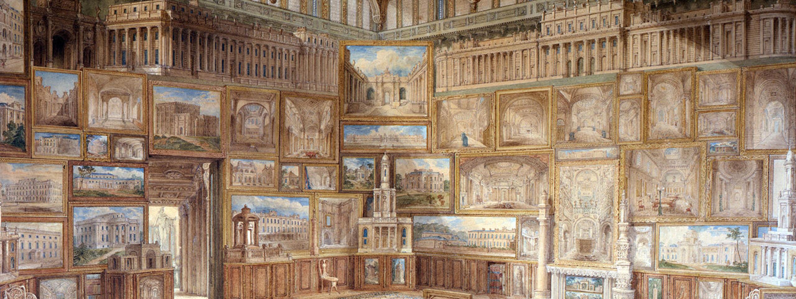 The Soane Museum is fortunate to have an abundance of Gandy’s works, but one of the most intriguing is also one that has been among the most inaccessible as it hung until recently in the Picture Room Recess. This work, which presents Soane surrounded by his works, speaks to Gandy’s adeptness in conjuring up an artificial world, much like the Grand Tour recreations of antiquity by Giovanni Paolo Panini, and it can be read as an extension of the same nostalgia that motivated Soane’s collection of antiquities. The connection with the world of Panini is even more explicit with a “riff” on the theme of a Soane retrospective exhibition.