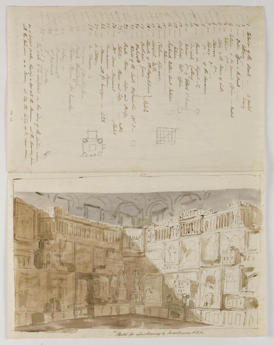 Like the more celebrated Public and Private Buildings Executed by Sir John Soane between 1780 and 1815 (P87, exhibited, RA, 1818), this one also has a preparatory sketch with an accompanying list of buildings included (Vol. 83/62), which raises the question to what extent Gandy was catering to Soane’s vanity or acting under instructions?