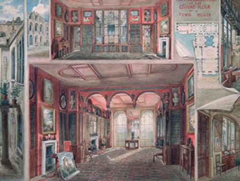Joseph Michael Gandy (1771 - 1843), Architectural composition of framed perspectives and models of buildings designed and executed by Sir John Soane, watercolour on paper. P96