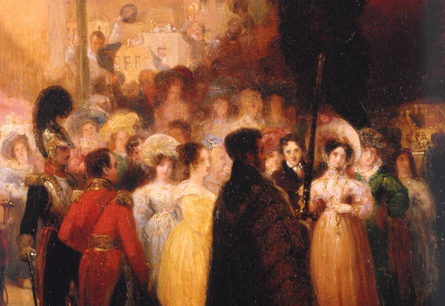 Mrs Sarah (Sally) Conduitt, who acted as Soane’s Housekeeper from 1816, shown here (in a yellow dress and white bonnet) with Soane facing the Lord Mayor at the Opening of London Bridge in 1831, in a detail from a picture by George Jones. SM P247 (detail)
