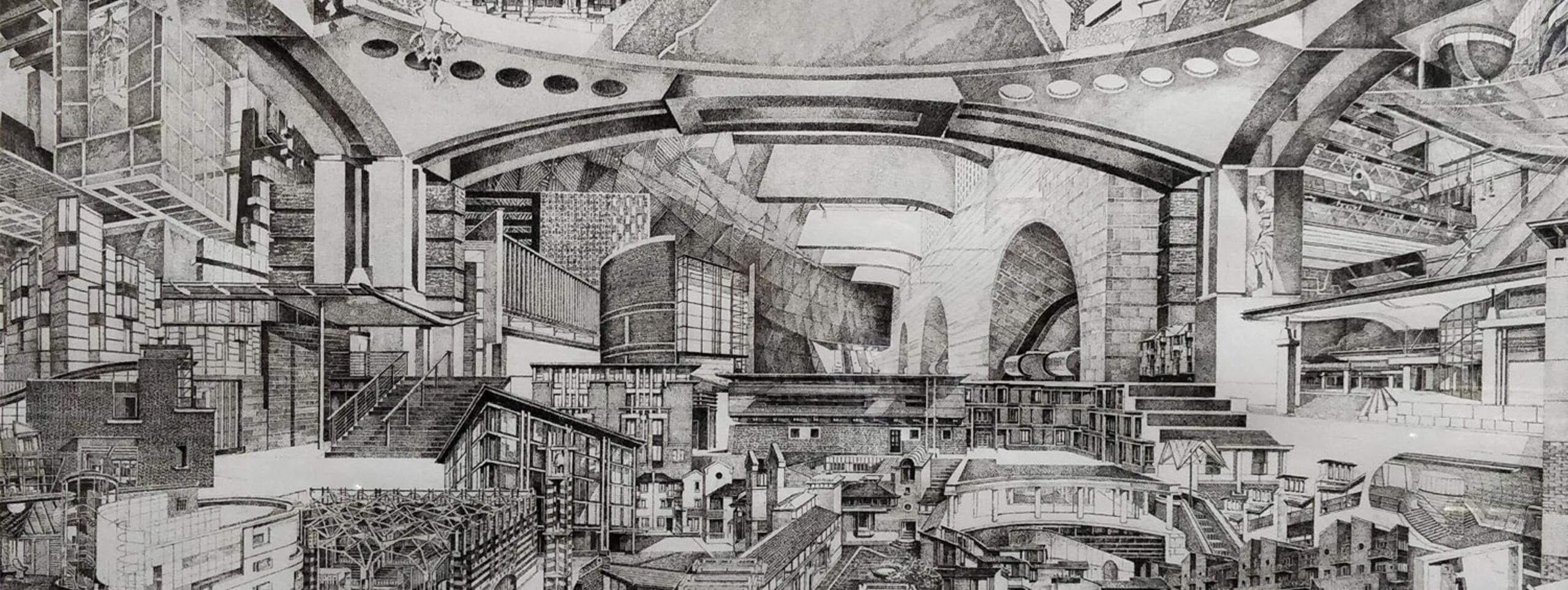 The work is not directly part of either of our exhibitions this summer: The Return of the Past: Postmodernism in British Architecture and Emily Allchurch: Visions of Architectural Fancy. However, it does create a nice bridge between the two. While MacCormac did not consider himself a postmodernist and rejected the label, his work explored ways of translating historical references into modern architecture that were comparable to some of the strategies employed by postmodern architects. And of course, Allchurch’s exhibition includes a literal re-creation of the Gandy using a complex technique of digital collage of her own original photography.