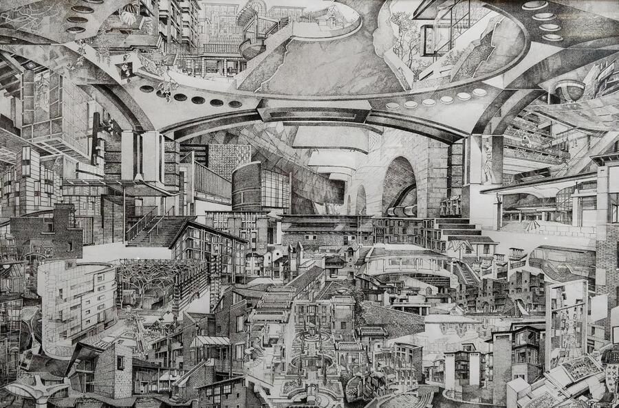 In its place, we are hanging a drawing by Peter Hull, depicting a composite view, closely inspired by the Gandy, of the works of the architect Richard MacCormac (1938–2014). Hull worked for MacCormac in the 1990s and is now an artist based in Barcelona. As you can see from the drawing, MacCormac was heavily inspired by Soane, borrowing and interpreting particular motifs as well as drawing from the ways Soane treated structure and light.