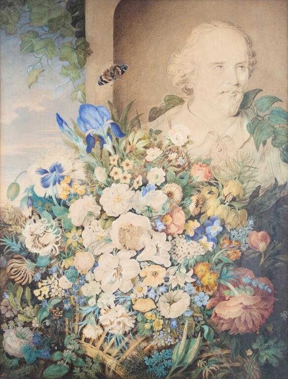 This work, painted by the artist Clara Maria Pope is one that most commonly catches the eye of visitors during tours of our Private Apartments. An 1837 inventory of the Soane describes it as 'The Bust of Shakespeare encircled by all the Flowers mentioned in his Works'. The bust seems to be that of Shakespeare by Scheemakers, of which Soane owned a cast (the original is on the poet's monument in Westminster Abbey). Read the full description of this work on our Collections Online database >