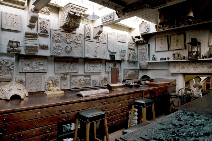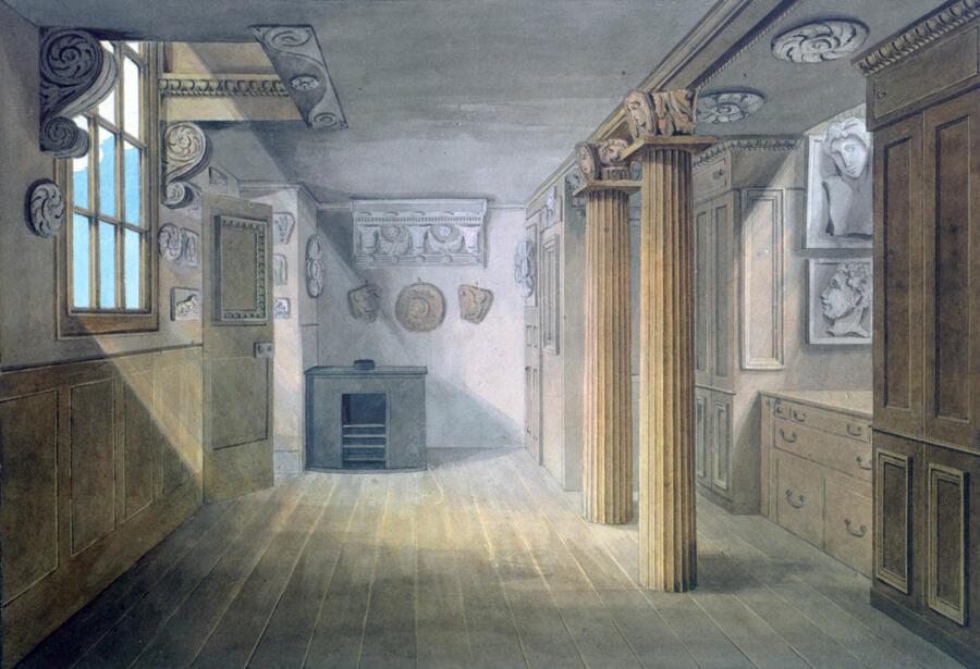 John Soane did not ever work in this busy office. He had his own ‘Little Study’, with a desk that he designed himself neatly fitted into the window bay and a pull-out table just the right size for a drawing board. The light that fell onto his work surface was modulated by the use of dwarf Venetian blinds whose angle could be changed by adjusting a turn-screw set into the top edge. It was also softened by the pale-yellow glass in the skylight above, filtering the bright sunshine. He looked out onto the Monument Court with its walls inset with a variety of architectural fragments salvaged from older buildings.
