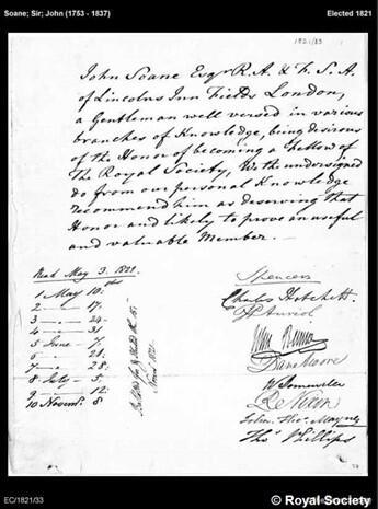 “John Soane Esqr RA & FSA of Lincolns Inn Fields London, a Gentleman well versed in various branches of Knowledge, being desirous of the Honor of becoming a Fellow of The Royal Society, We the undersigned do from our personal Knowledge recommend him as deserving that Honor and likely to prove an useful and valuable Member."