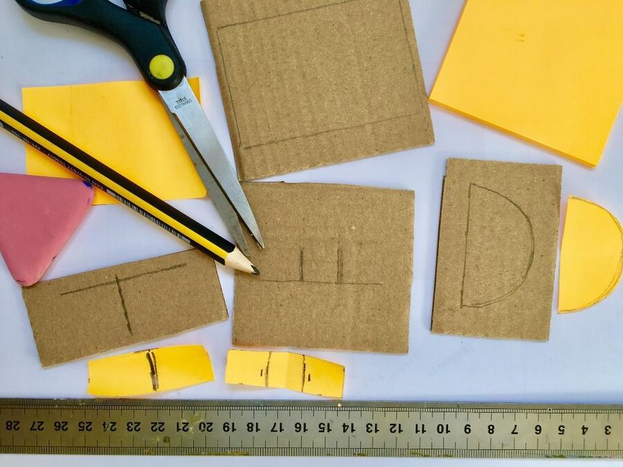 Onto your three drawings of window parts, cut some double-sided tape and put it onto the drawing. Peel off the sticky back. Glue can be used instead!