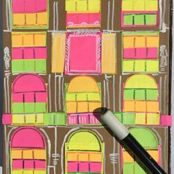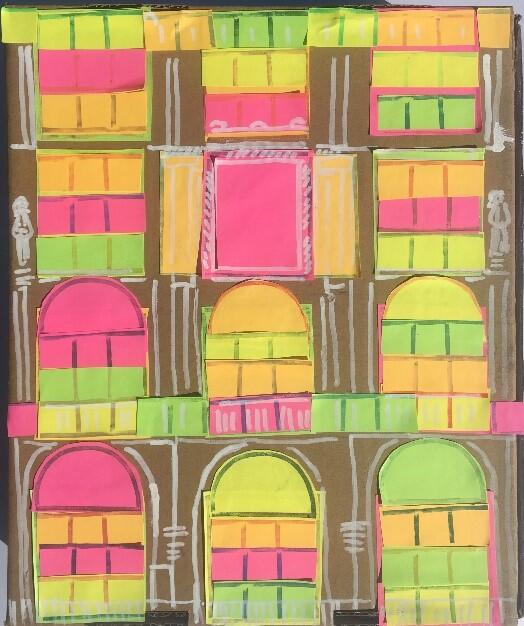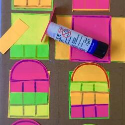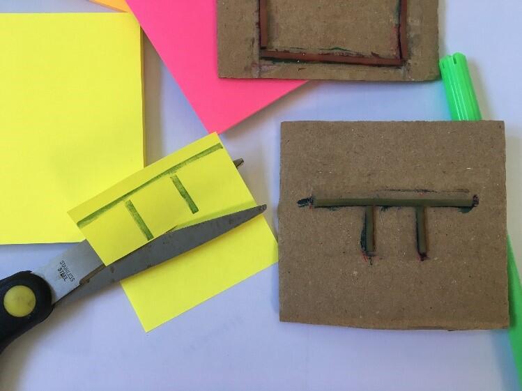 Use glue or tape to stick down your stamped post it notes onto a big piece of cardboard, to make the windows of your post-it Museum!