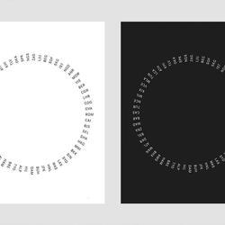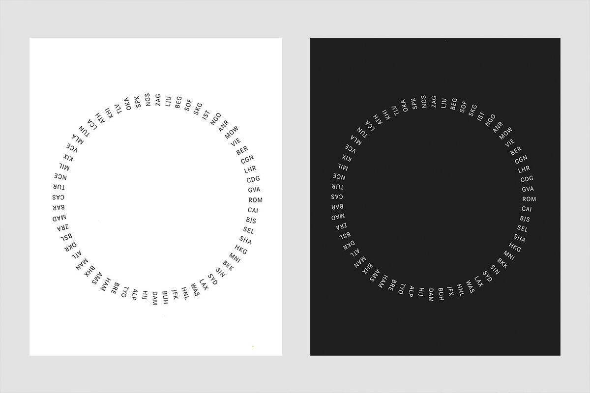 Frozen Sky (Night & Day) Frozen Sky (Night & Day) Frozen Sky (Night & Day) 2000 2 screen process prints on Somerset satin 300 gsm 70 x 66 cm (each) Cristea Roberts Gallery, London Each print comprises a circle composed of airport codes. x prev next