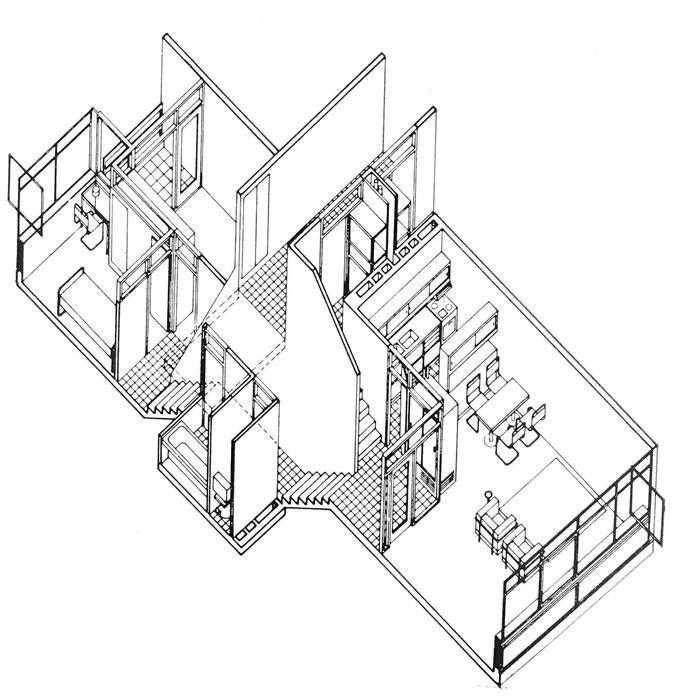 It is ingenious if complex, and unexpected in the context of the rationalism of the exterior. As students at the AA, ten years before, we had been obsessed with ‘half level’ planning. The advantage was thought to be the omission of ‘dogleg’ stairs and half landings. This enabled spaces to easily ‘swim’ into one another, by means of short single flights. But for a builder, before the dividing partitions are in, equal half levels meant there was always some doubt about where an apartment might end or begin. Ken’s design certainly challenged the contractors. I remember the foreman, faced with these immaculate drawings, shaking his head and remarking, ‘That young Kenny…’ – well, you can imagine the words that might have followed.