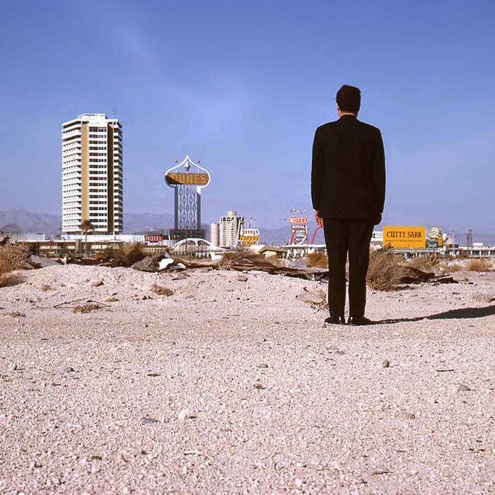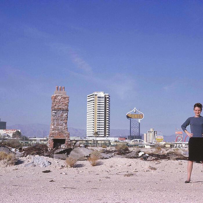 We even went behind, to those fantastically interesting spaces at the backs of the billboards and casinos. And back yet further, in the open desert that was then behind the casinos, I staged the famous portrait of Bob. I should also say that this was not how Bob normally dressed, but that morning we had been to a city agency asking for funding for our research and Bob wore his most serious suit. He had also spoken to a reporter, which produced a headline in the local paper, ‘Yale Professor Will Praise Strip for $9,000’. In the end, we secured free room and board for everyone at the Stardust Hotel and Howard Hughes lent us his helicopter for an hour.