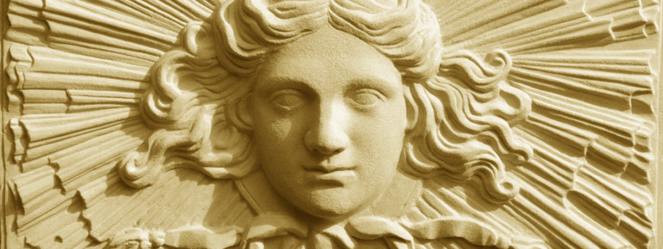 The original of this Haddonstone piece is from a frieze, a long horizontal band often found on the exterior of buildings and adorned with sculpture or decorative ornament. In this case the ornament is marble, and the head, presumed to be an impression of Apollo, is youthful, unmarked by the passage of time, and rendered dynamic by the wavy flowing hair that seems to billow away from the face. The highly articulated, very linear sunburst behind the head provides a distinctive and surprisingly modern contrast.