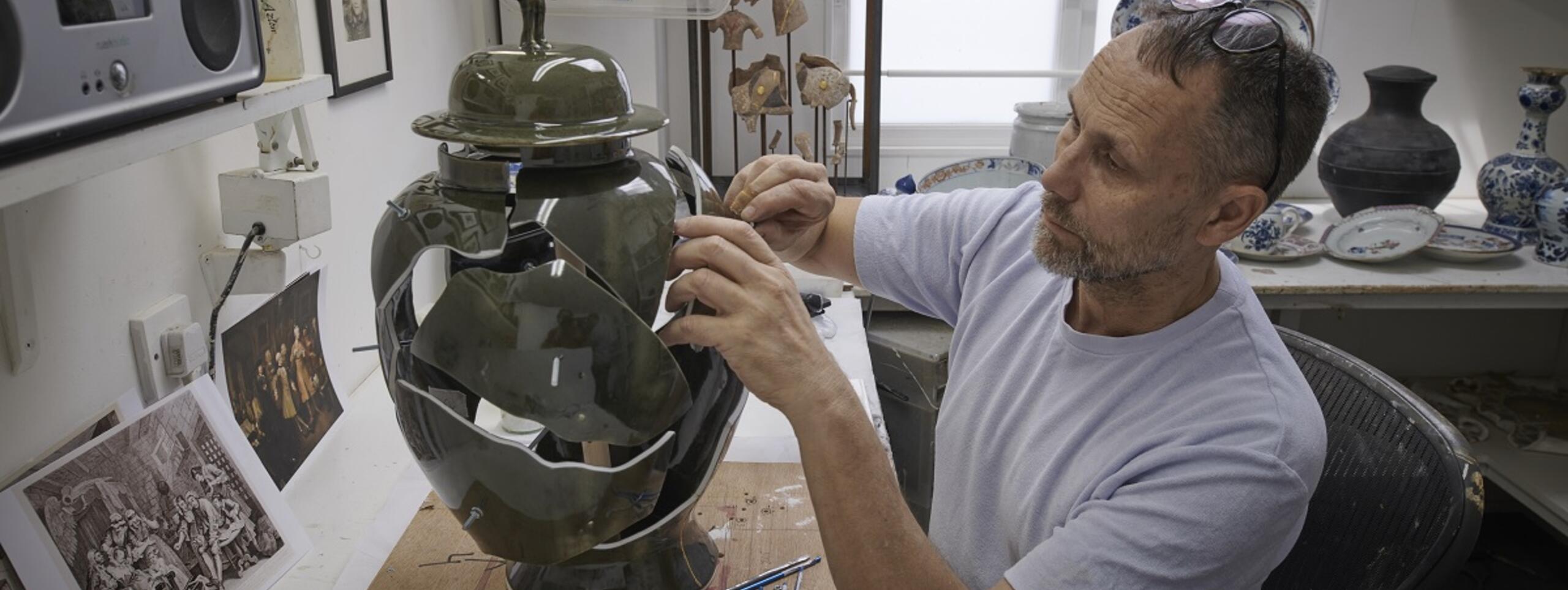 De Vries sees an inherent value in the discarded objects he reinvents, giving a new lease of life to a broad spectrum of ceramics otherwise destined to be thrown away. His pieces are often humorous, sometimes shocking, but always reinvent significant, yet damaged, historical materials, whilst adding unexpected twists to their ongoing narrative.