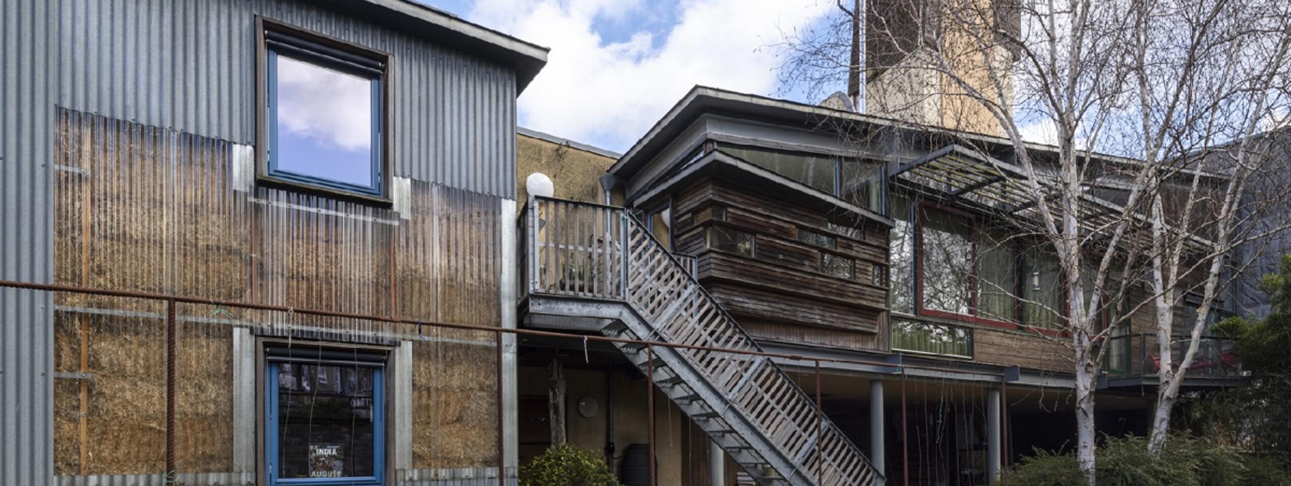 Completed in 2001, 9/10 Stock Orchard Street was built to be the home of architect Sarah Wigglesworth and architect-educator Jeremy Till and also contains the offices of Sarah Wigglesworth Architects. With this experimental self-build project, her first, Sarah acquainted herself with methods of building using a palette of ordinary materials. Straw bales provide insulation for the home’s bedroom wing and sandbags provide a barrier against the noise of the train line adjacent to the plot. Elsewhere, materials such as recycled concrete in the gabions, railway sleepers and newspaper are upcycled from other products. Although now over twenty years old, the buildings have instigated an ongoing debate about the use of resources and aesthetics in current architecture.